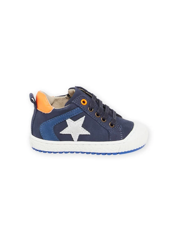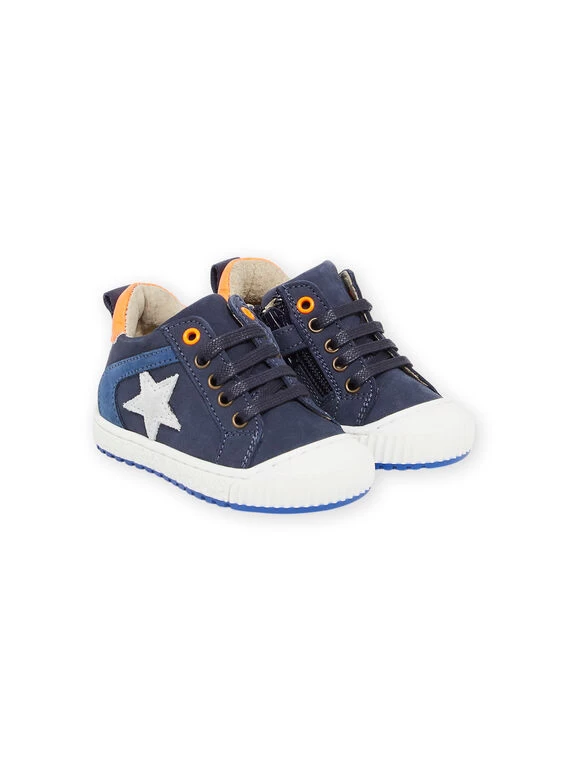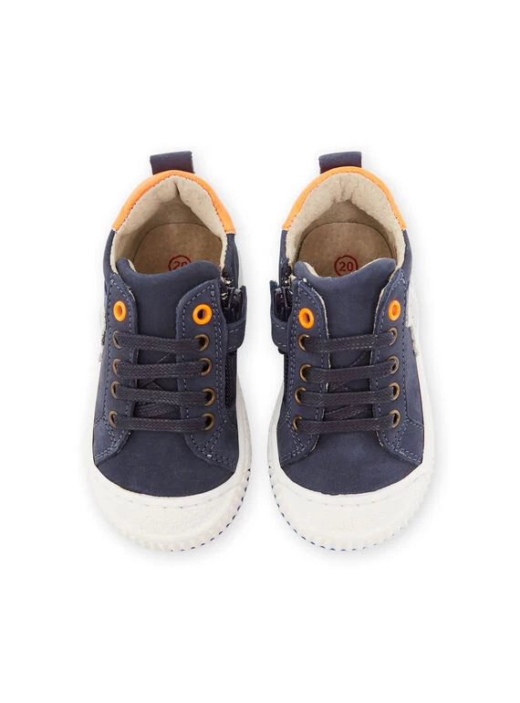 Baskets montantes en cuir bleu marine avec détails fluos.
