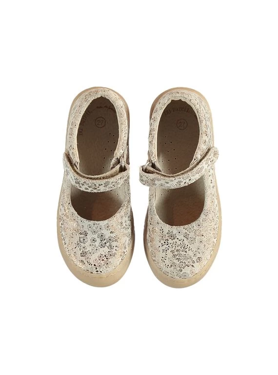 Babies en cuir fantaisie or. Fermeture pratique grâce à la bande auto agrippante. Semelle extérieure remontant à l’avant pour une meilleure protection.