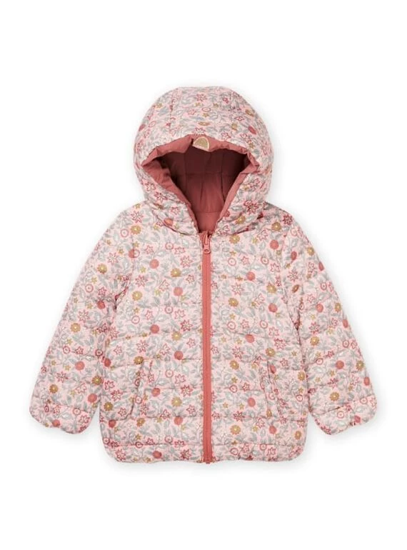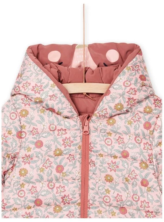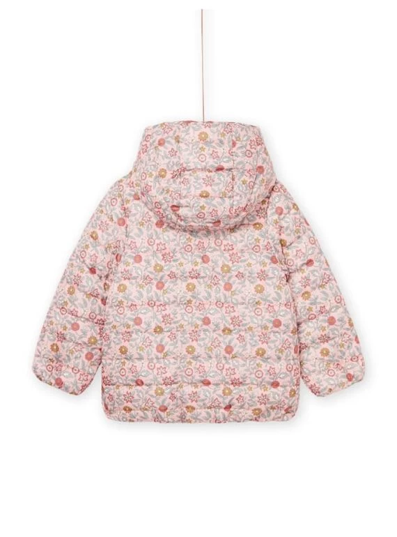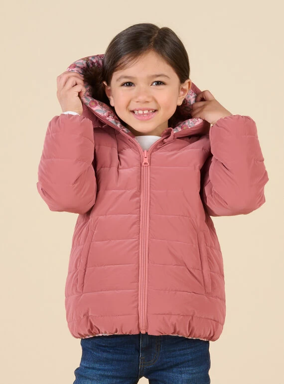 Doudoune à capuche réversible face unie et face imprimé fleuri.