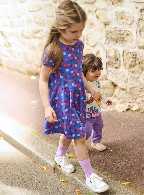 Découvrez notre ravissante robe bleue pervenche à imprimé fruits, parfaite pour les journées ensoleillées et les occasions spéciales.