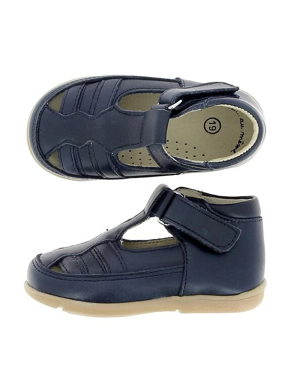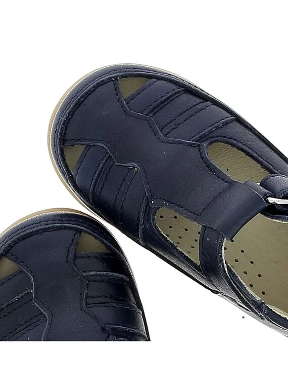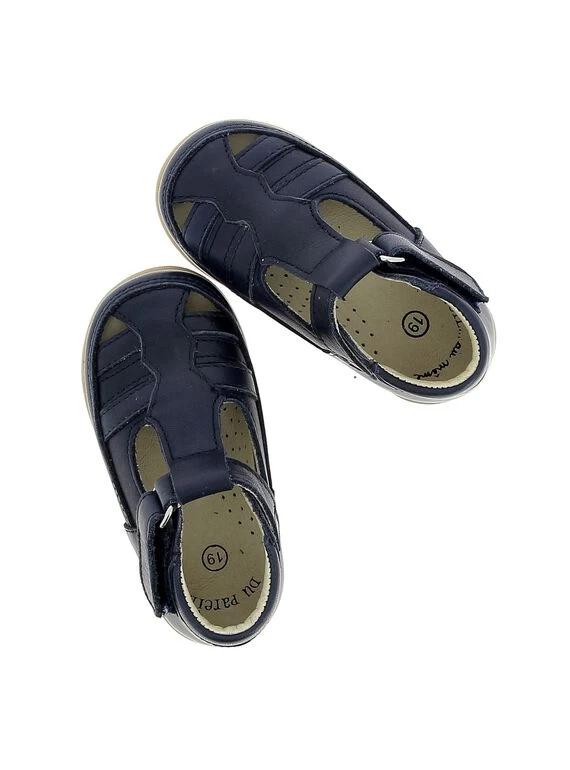 Salomé bébé garçon en cuir bleu marine. La forme se rapproche de celle d’une sandale par la présence de fausses brides sur le devant. Doublure et semelle intérieure cuir pour un environnement sain et plus de respirabilité. Fermeture réglable par bande auto-agrippante. Semelle souple en élastomère, exclusive DP…am. Fabrication européenne.