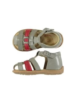 Sandale en cuir gris rehaussée d’une bride rouge.
