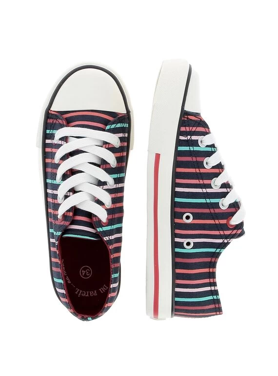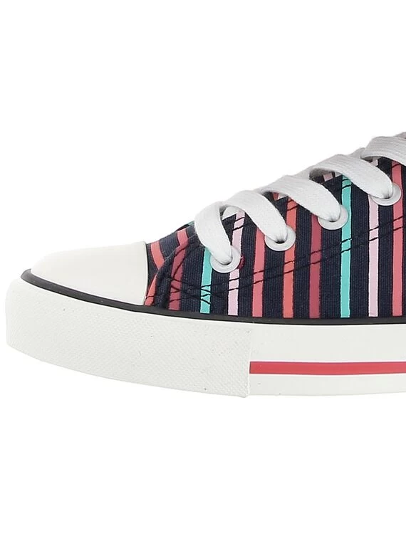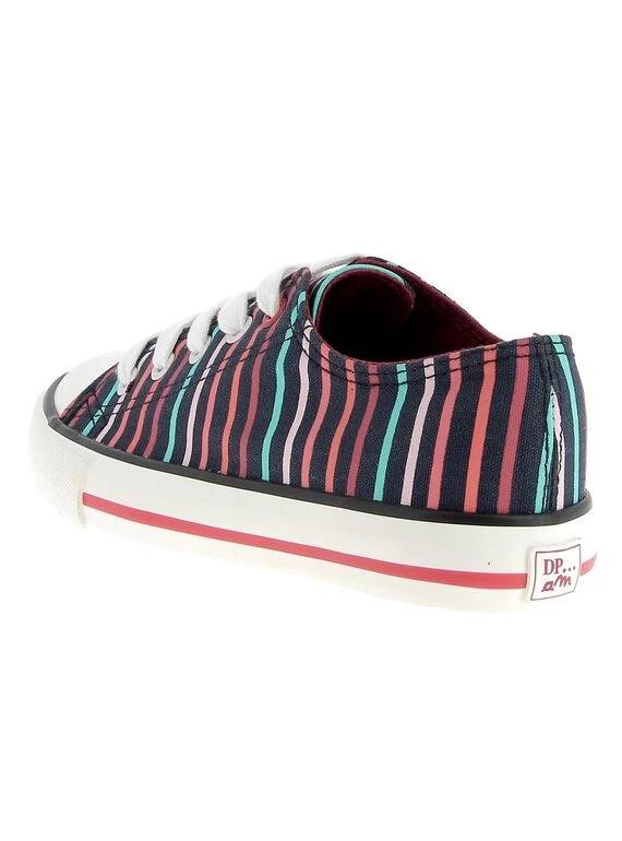 Tennis basse fille en toile bleu marine, rehaussée d’un imprimé rayé multicolore. Premiers oeillets colorés en rouge. Protection en caoutchouc à l’avant. Système de fermeture par lacets. Semelle en caoutchouc vulcanisé pour une meilleure solidité.